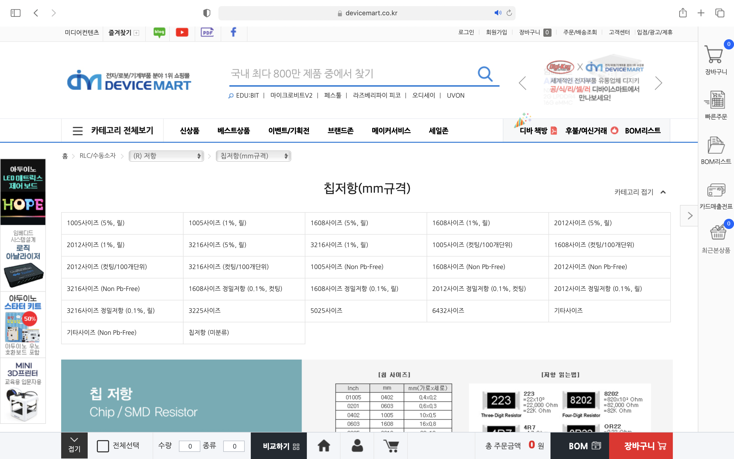 | 칩저항 | 크기가 매우 작다 | 납땜해서 사용해야 함(빵판에 구성 불가능) | - |
